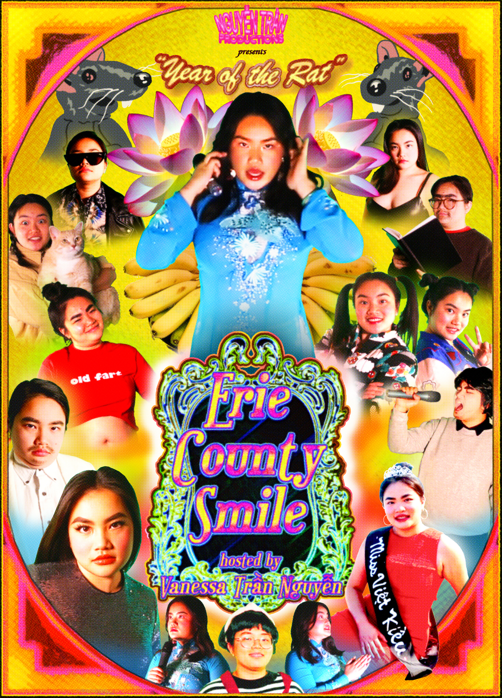 Van Tran Nguyen introduces her newest project: a film called Erie County Smile (2021). Erie County Smile is a satire of “Paris By Night” (PBN), a popular Vietnamese-language variety show. PBN gained notoriety in the Vietnamese diasporic community by the mid-1990s and is still in production today. Music from the live shows was recorded and commonly played at Vietnamese-owned businesses all over the world. In the waiting area of my family’s nail salon, we always had PBN in the VHS player.